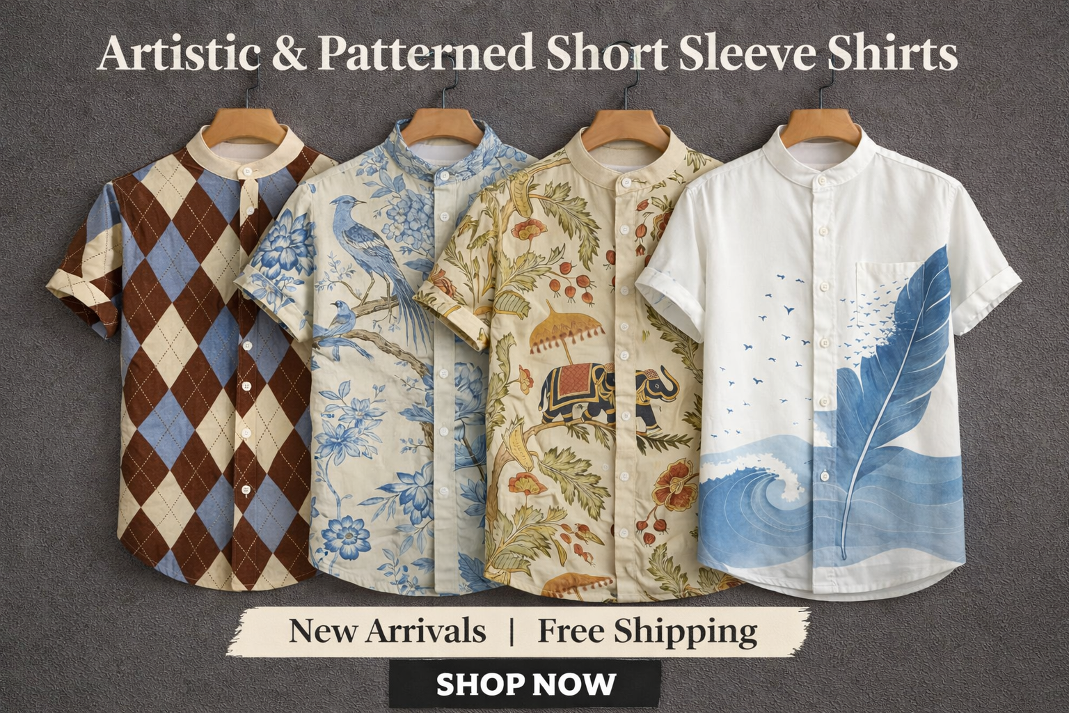 Men’s Ocean Wave Feather Print Shirt – Minimal Aesthetic Mandarin Collar Shirt | Velloria.shop